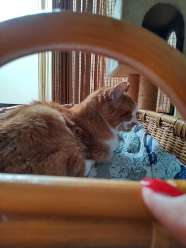 いな爺は、ここんところ湿気ていたのが元に戻ってきたので、私の朝食が済んだのを見計らって、横に来てぐずぐず鳴いて、出っ腹を貸せとか愛でろとか言ってくるので、「かわいいねぇぇぇぇ♡」といってチューーーーー♡をすべく顔を近づけると、頭をフッと後ろ…
